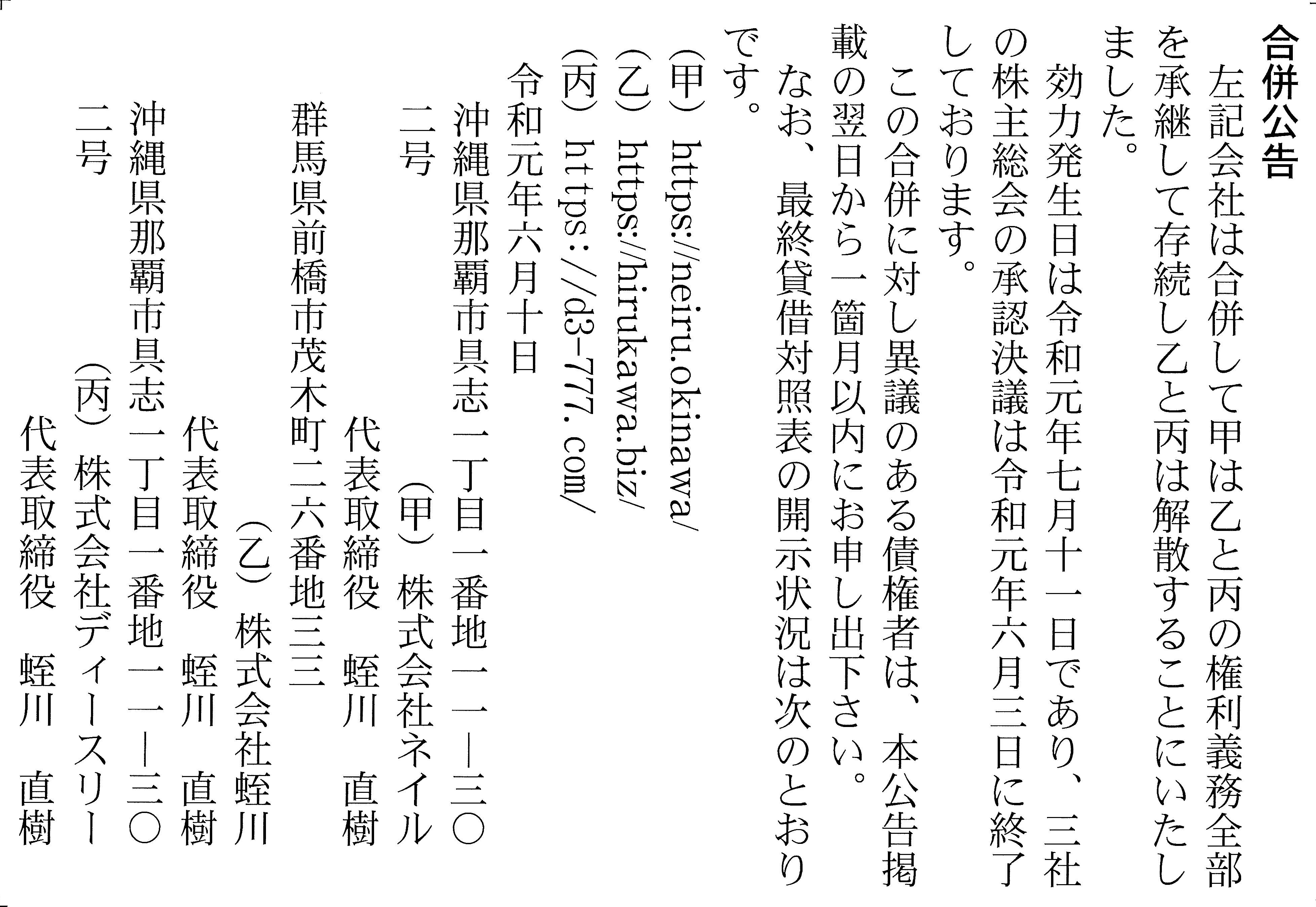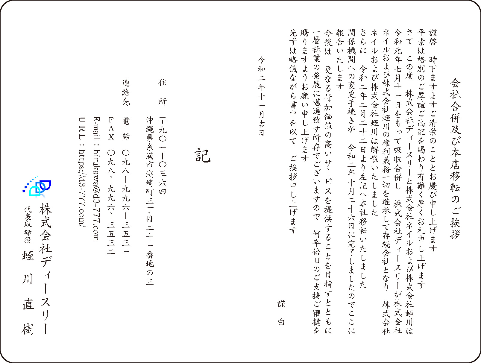 合併公告 本店移転 会社情報 会社名 株式会社ディースリー 設立 平成19年9月4日 事業内容 各種ソフトウェアの開発 住所 〒901-0364 沖縄県糸満市潮崎町3丁目21番地の3 電話番号 098-996-3531 メールアドレス info@d3-777.com